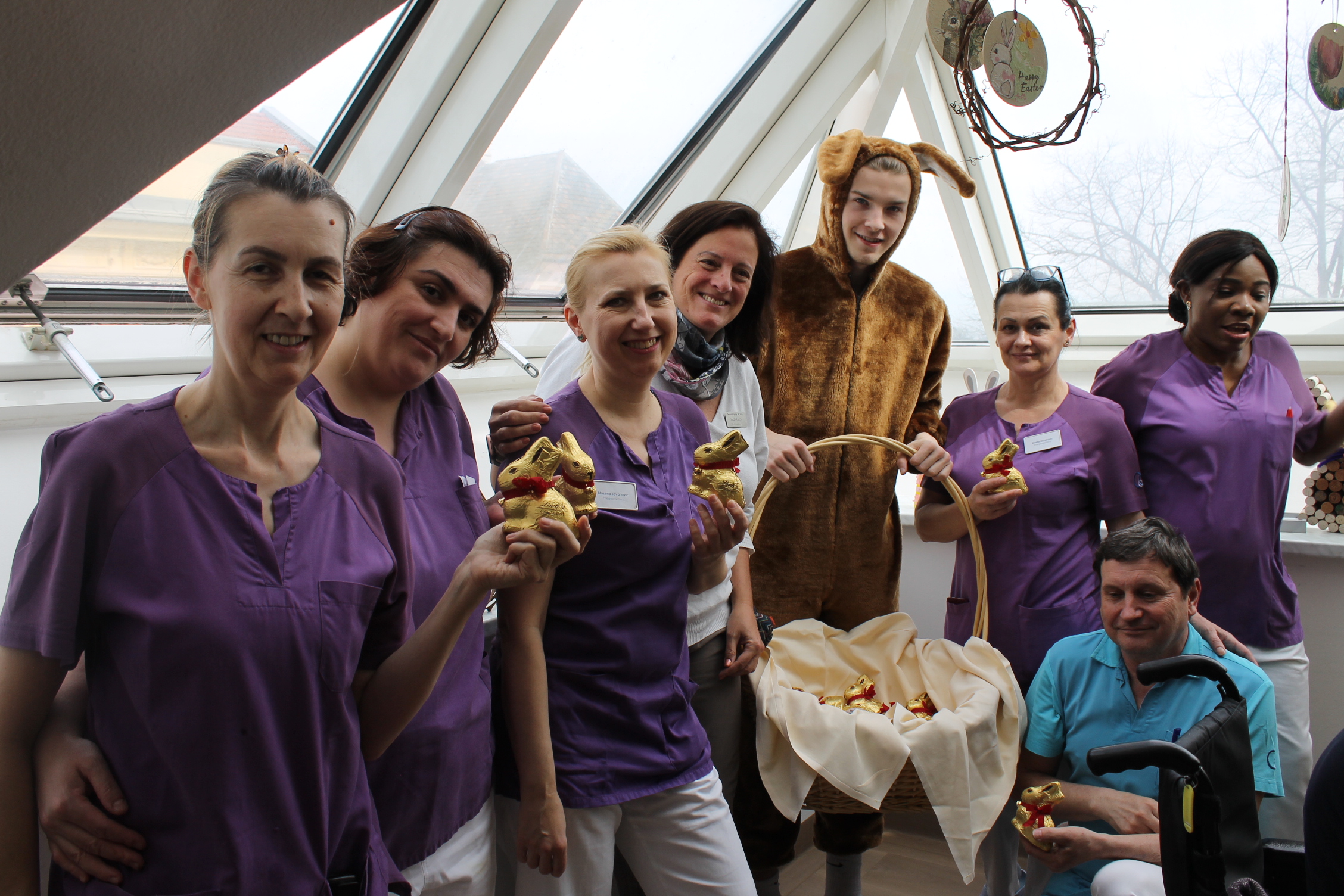Auch die Mitarbeiter:innen der SeneCura Residenz Grinzing freuten sich über einen Ostergruß, vor allem wenn der Hase persönlich vorbei hoppelt. Ein verkleideter Osterhase hat nämlich das gesamte Team des Hauses mit einem Schokoladenosterhasen überrascht. Über die süße Aufmerksamkeit freuten sich alle sehr und konnten es kaum erwarten, den Schokohasen zu vernaschen.