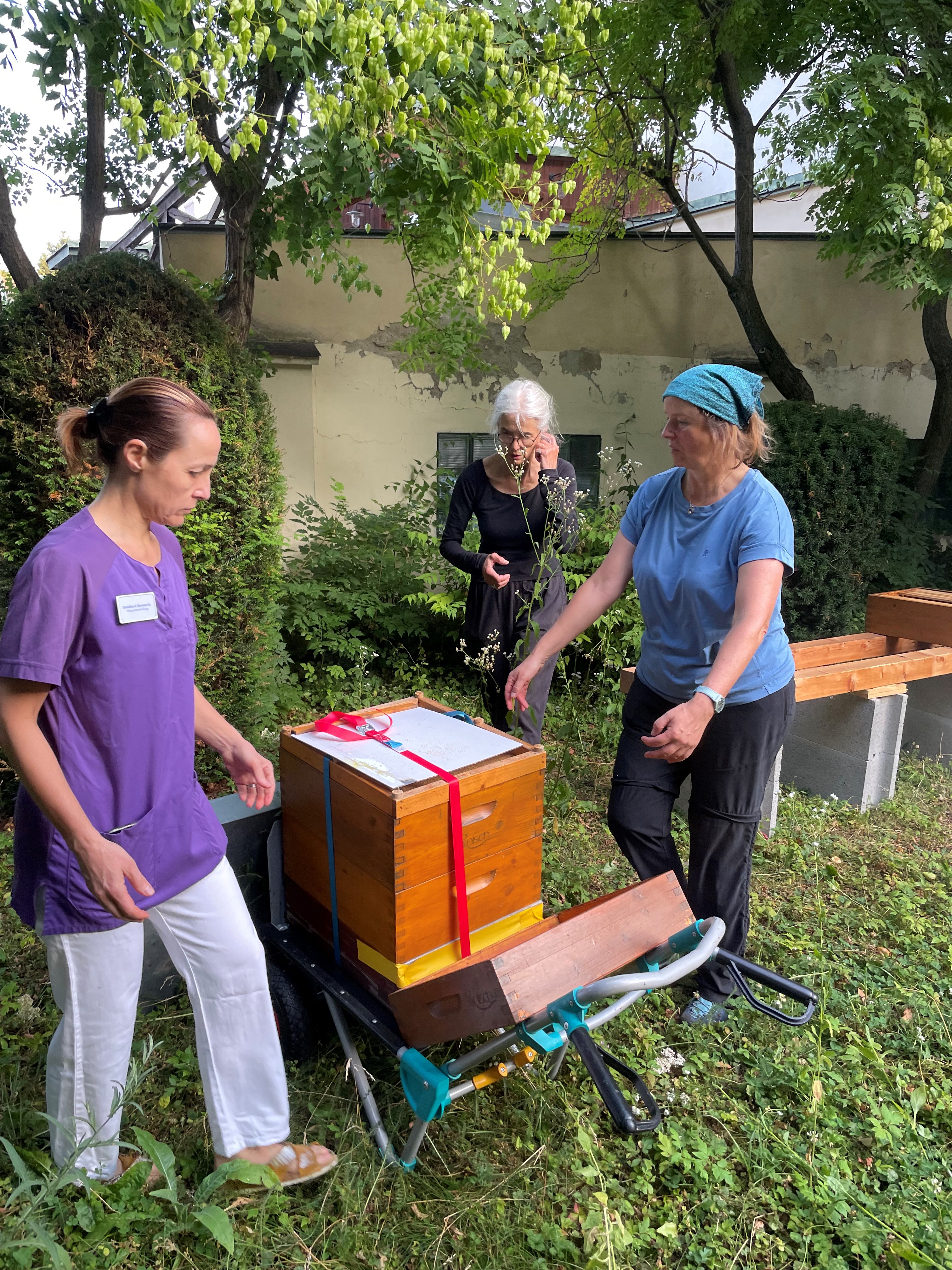 Pflegedienstleitung Dessislava Stevanovic half den Imkerinnen Ingeborg Hirsch und Hildegard Burgstaller beim Einzug. Sie ist gerade selbst privat in einem Imkerlehrgang.