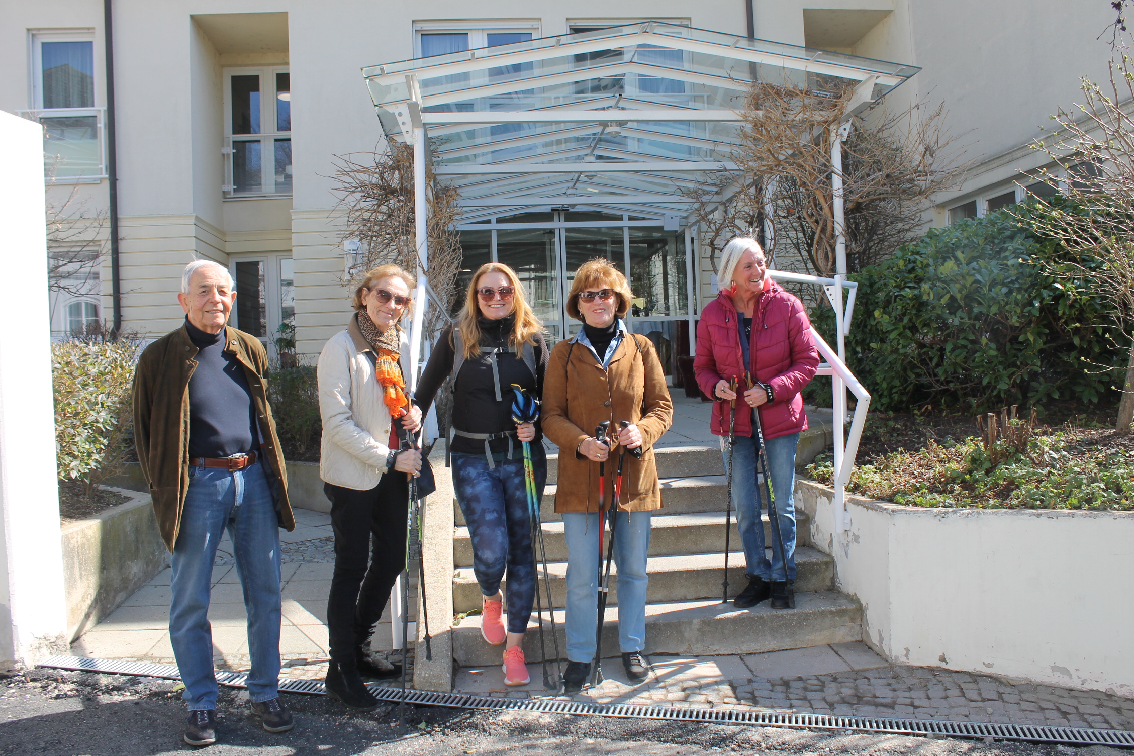 Unlängst versammelten sich einige Bewohner:innen der SeneCura Residenz Grinzing bei strahlendem Sonnenschein zum gemeinsamen Nordic Walking. Nordic Walking ist das ideale Training für ältere Menschen, da es gelenkschonend ist, die Muskeln stärkt und Osteoporose vorbeugen kann. Zudem wird das Herz-Kreislaufsystem positiv stimuliert. Nach einer kurzen Aufwärmphase marschierten die Teilnehmer:innen schon sehr selbstbewusst mit den Stöcken in den schönen Park, der schon fleißig vor sich hin blüht. Die gemeinsame Bewegung an der frischen Luft hat Spaß gemacht und die Bewohner:innen freuen sich bereits auf die nächste Nordic Walking-Einheit.