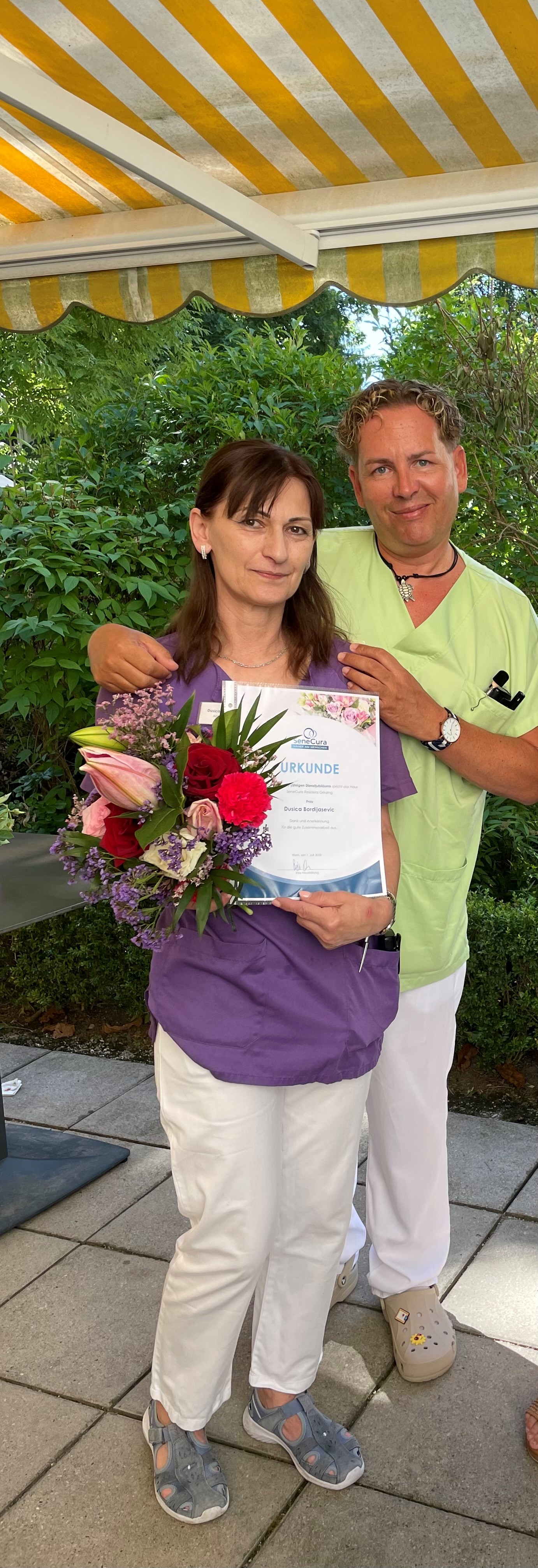 In der SeneCura Residenz Grinzing wurde unlängst ein 15-jähriges Dienstjubiläum gefeiert. Anlässlich dessen wurde der Abteilungshelferin, Dusica Bordijasevic, ein schöner Blumenstrauß sowie eine Urkunde überreicht. Der Pflegekoordinator des Hauses, Franz Lorenz, gratuliert im Namen des gesamten Teams herzlich zum Dienstjubiläum und freut sich auf eine weitere gute Zusammenarbeit!
