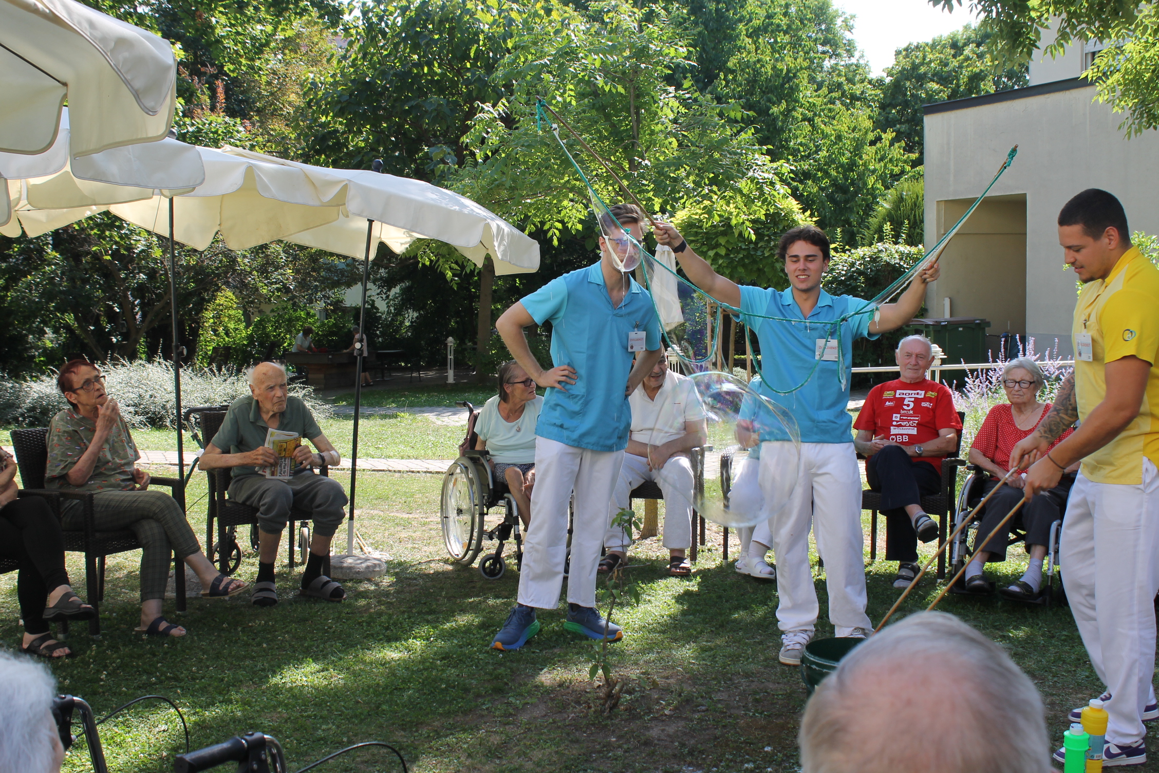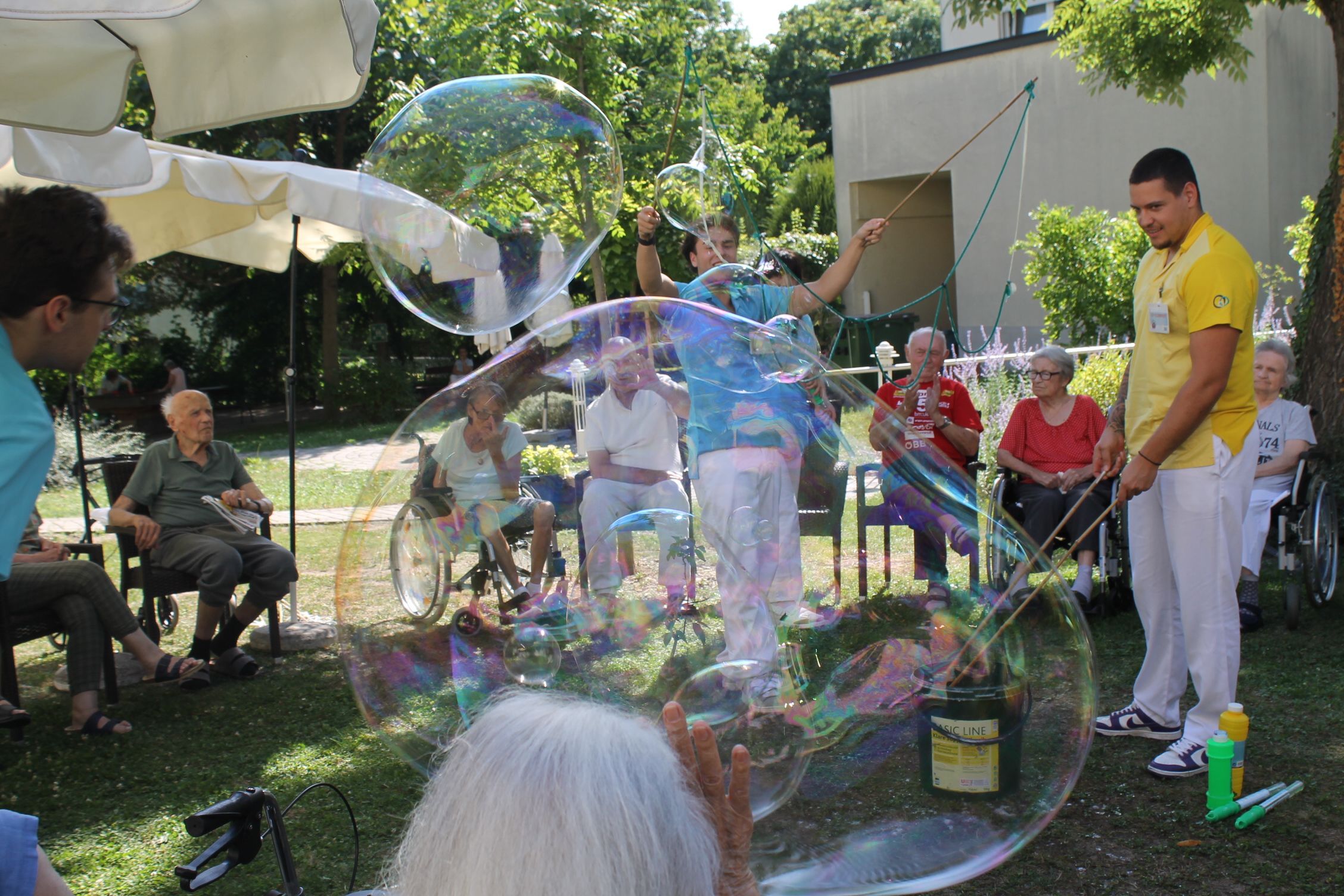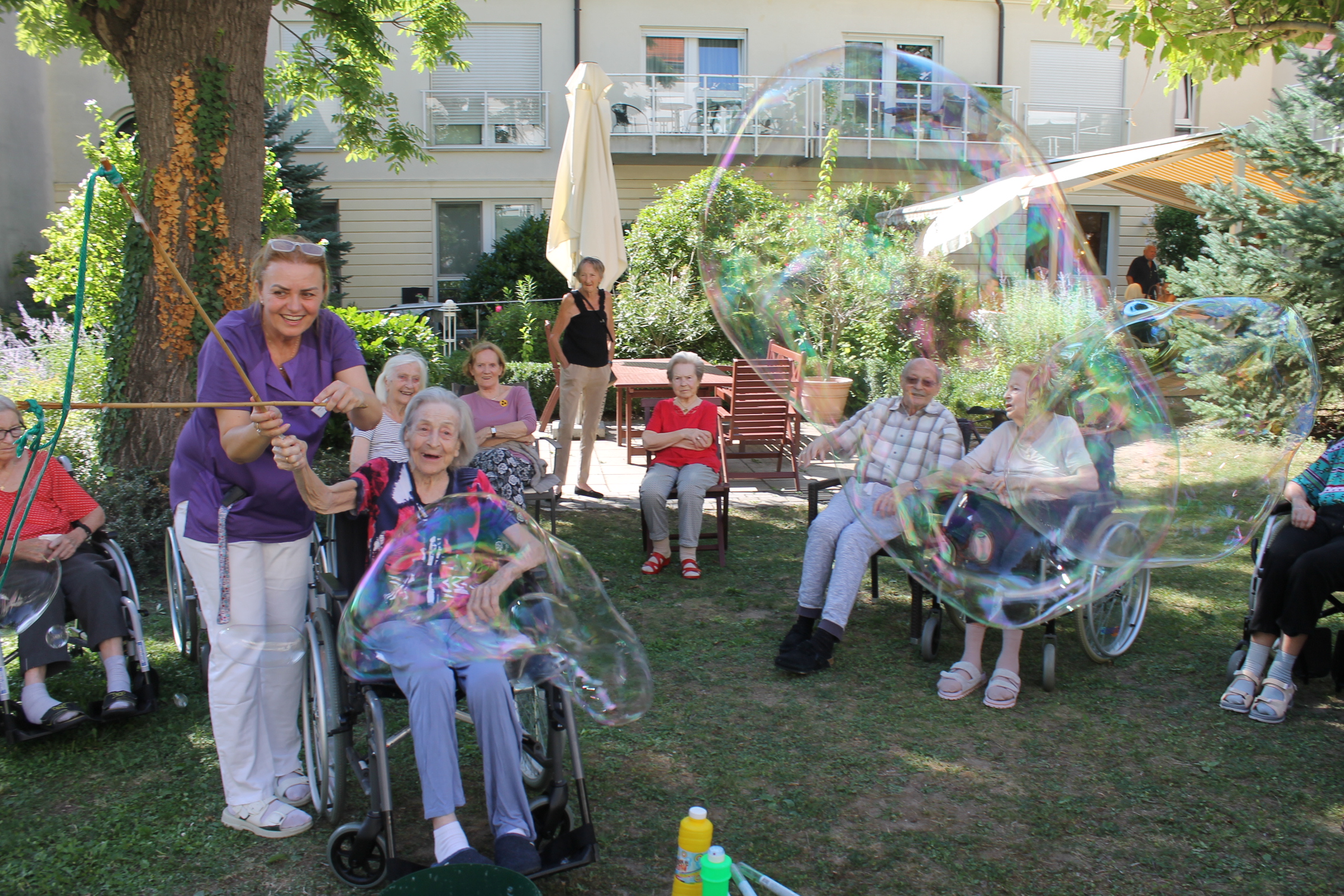 Für staunende Augen und fröhliches Lachen sorgten die riesigen Seifenblasen, die kürzlich im hauseigenen Garten der SeneCura Residenz Grinzing in die Luft stiegen. Die schwebenden Kunstwerke zauberten den Bewohner:innen ein Lächeln ins Gesicht und ermöglichten einen besonderen Nachmittag voller Leichtigkeit.